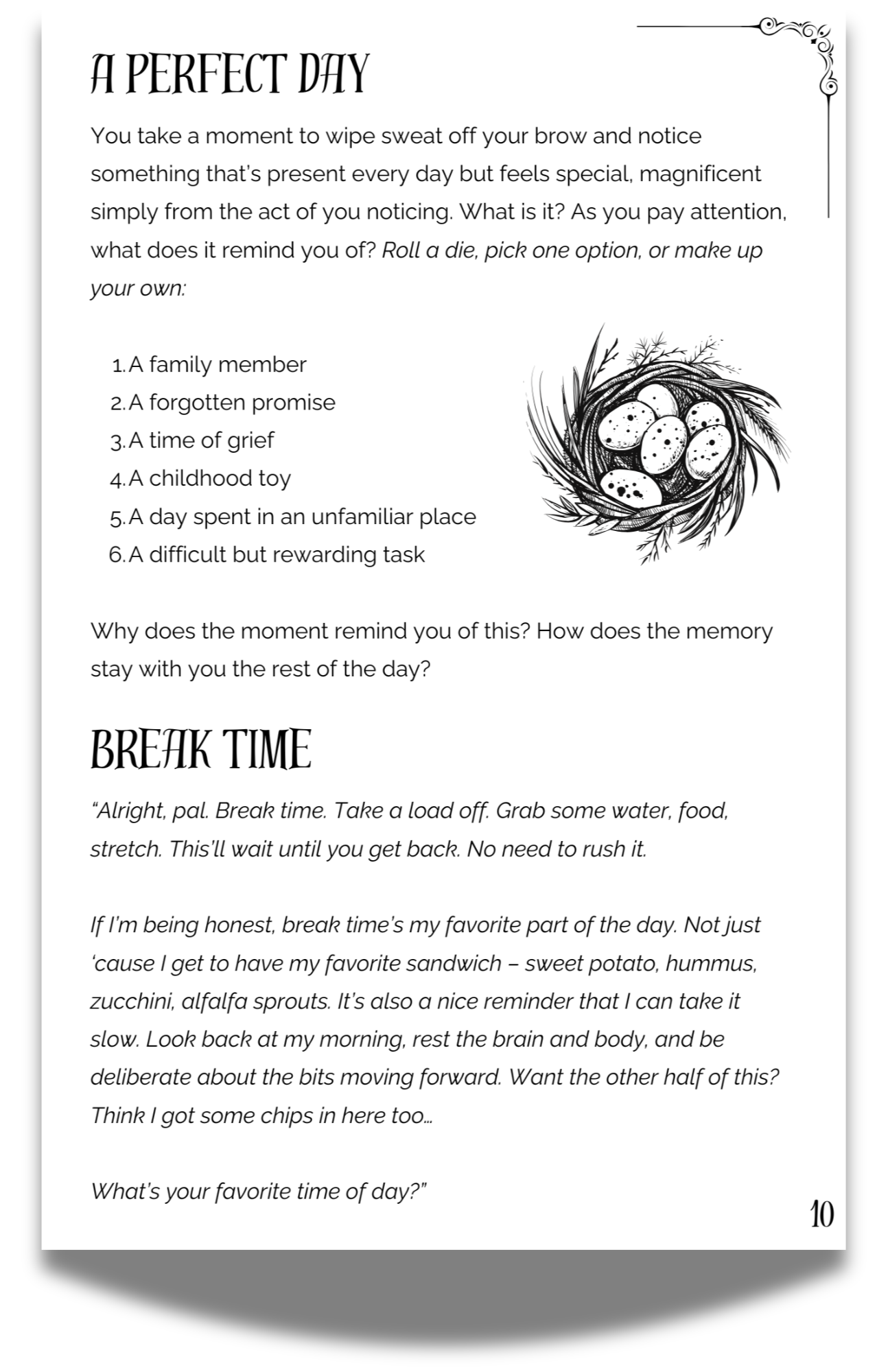 As a player, your goals are to find the significant in the everyday, to nurture joy and resilience through caring for your community and yourself, and to live in the extra-ordinary present.